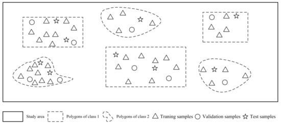 First, some polygons in the study area were labeled manually. Then, sampling points were randomly selected for training, validation, and test sets according to the ratio 4:1:1 (see Figure 9). Subsequently, 2000, 500, and 500 samples of each class for the training set, validation set, and test set, respectively, were obtained. Finally, the experimental data sets contained five groups of training, validation, and test sets. More detail of the data sets can be found in Table 2. Similarly, for the imagery on 11 November 2020, the training, validation, and test sets with 2000, 500, and 500 random samples, respectively, for each land cover were also constructed.