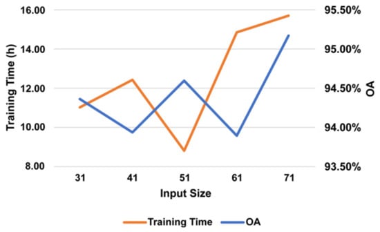 Training time and overall accuracy (OA) for the experiment of input size selection.