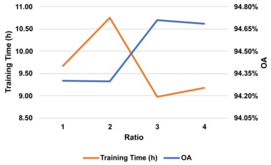For this experiment, we used 51 as the input size of DEM and 15 as the input size of the spectral data. The values of k were set from 1 to 4, in which 1 represented the original model, while 2, 3, and 4 represented the magnifying models. Specifically, we limited the value of k to a maximum of 4 because a larger kernel size caused small feature maps. If the value of k was set to 5, the feature maps in the middle of the model would be smaller than the kernel size, which would lead to model construction failure. Each value of k was applied to five random tests. As shown in Figure 13, when the k-value was set to 3, the model achieved the highest OA and took the least amount of time. It is of note that 51 divided by 15 is 3.4 which is greater than 3 and less than 4, and closer to 3. Therefore, from this point of view, a k-value of 3 was also most suitable for the model.
