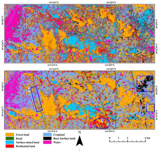 Overall, the two maps in Figure 16 were visually accurate. There were three main differences between the maps of FLCC in Figure 14 and Figure 16: (1) there were more fallow lands in Figure 16, especially at the upper right corner; (2) there were more green dry lands in Figure 14. These two differences could be attributed to the seasons of the two images (one was in summer and the other in autumn); (3) there were some misclassifications in Figure 16. For example, many croplands at the bottom left corner (the area of 2) were classified as nursery. The dumping ground, crop land, and residential land (i.e., the areas 1, 3, and 4 in Figure 16) that were derived by the imagery on 11 November 2020 were better than those obtained on 20 June 2012.