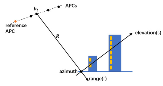 Diagram of TomoSAR imaging geometry. TomoSAR expands the spatial resolution in the elevation direction by coherent antenna phase centers (APCs), represented as a series of black points.