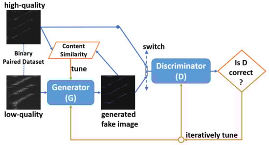 The CGAN consists of two models, the generator and the discriminator, as shown in Figure 6. The generator produces a fake result as similar as possible to the high-quality ground truth based on the low-quality input. The role of the discriminator is to distinguish the fake result and the ground truth. Through iterative optimization, the generator needs to produce a result as similar as possible to make the discriminator believe it is the truth, and the discriminator needs to distinguish the fake result from ground truth as much as possible.