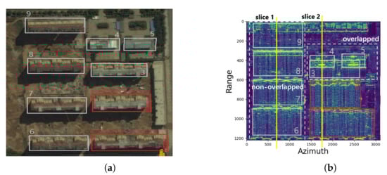 There are nine buildings in Figure 9, which are indicated with rectangles and numbered in both the optical and intensity SAR images correspondingly. The buildings #1 and #2, marked with red color, are selected as training set, and the other buildings with white color are the testing set. Obviously, in the SAR image, three (#3, #4, #5) buildings are overlapped. Meanwhile, the four (#6, #7, #8, #9) buildings are nonoverlapped. Both the overlapped objects and nonoverlapped objects are indicated with white dotted rectangles. In order to explain the reconstruction results of overlapped and nonoverlapped objects more intuitively, two slices are selected at the positions of slice 1 and slice 2 in Figure 9b. Slice 1 is the elevation-range image of buildings #6, #7, #8, and #9, while slice 2 is the corresponding view of buildings #1, #2, #3, and #4. Building #5 shared the same characteristics as building #4 and is not listed here.