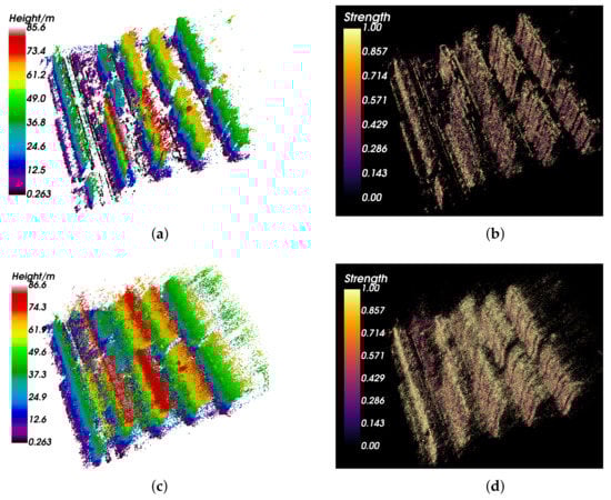 3D reconstruction results of all-track and three-track TomoSAR. Panel (a) is the 3D height distribution of all-track TomoSAR scatterers. The buildings can be easily distinguished. The structures of buildings are refined. Panel (b) is the normalized strength distribution of all-track TomoSAR. The dominant scatterers mainly locate at the surface of buildings. Panel (c) is the height distribution of three-track TomoSAR. The structures of buildings are fuzzy. Besides, there are also lots of artifacts and outliers. Panel (d) is the normalized strength distribution of three-track TomoSAR. Compared with all-track results, the strength distribution is worse with lots of powerful artifacts and outliers, which makes the height distribution of buildings fuzzy and declines the quality of reconstruction.