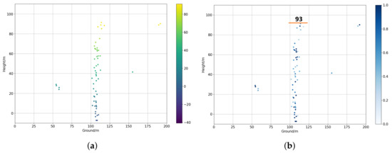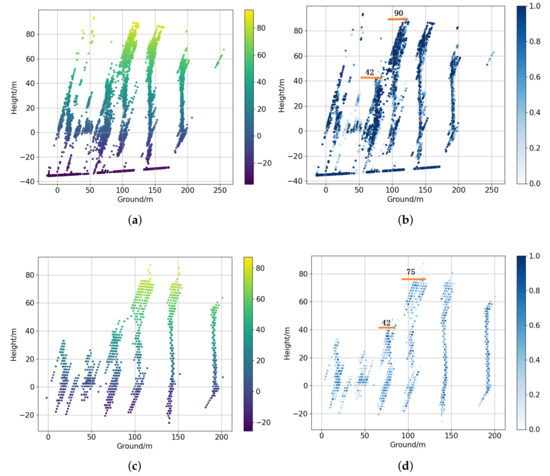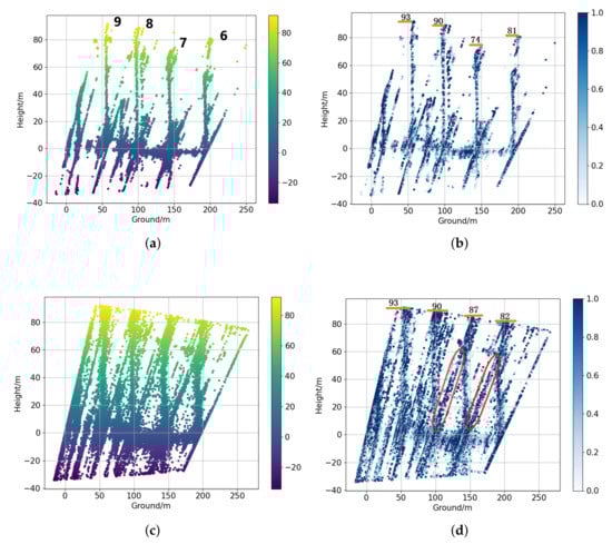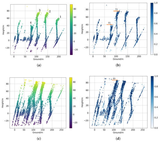 Figure 11a,c are the height maps of all-track and three-track TomoSAR results of nonoverlapped buildings #6, #7, #8, and #9, while Figure 11b,d are normalized strength maps. Compared with all-track TomoSAR results, the results of three-track TomoSAR are much worse with lots of artifacts and outliers. Besides, there is inevitable powerful multipath scattering [36] marked with red circles that affects the structures. In addition, the heights of buildings are estimated and labeled with orange lines in strength maps.