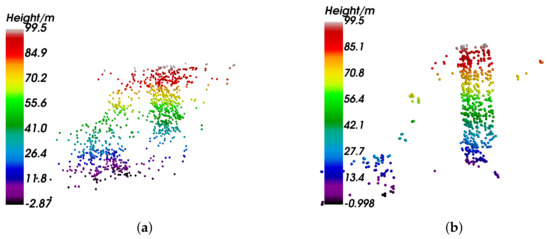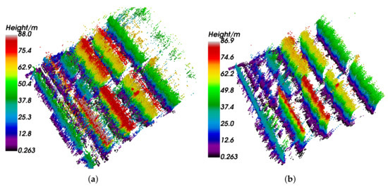 Comparison of entire scene 3D reconstruction between the nonlocal algorithm and proposed CGAN method. Panel (a) is the reconstruction result of the nonlocal algorithm. Panel (b) is the reconstruction result of the proposed CGAN method. Comparatively, the quality of the CGAN method is higher with fewer artifacts and outliers. In addition, the structures of buildings are much clearer, and are closer to the results of all-track TomoSAR.