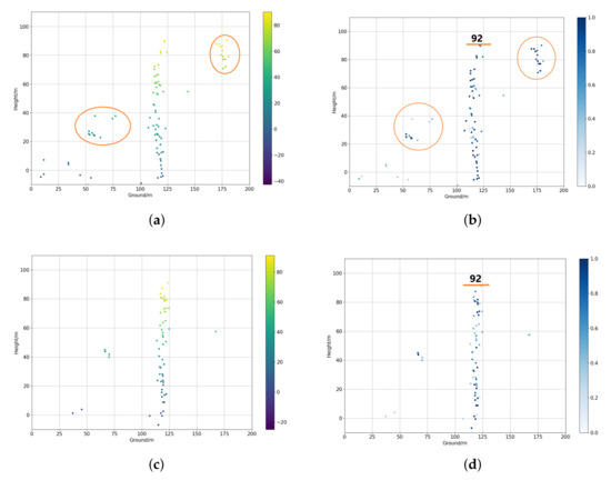 Reconstruction results of CS method using three and all tracks at the position indicated by the red line in the SAR intensity image. Panel (a) is the height map of three-track TomoSAR. Panel (b) is the normalized strength map of all-track TomoSAR. The orange circles indicate the outliers. Panel (c) is the height map of all-track TomoSAR. Panel (d) is the normalized strength map of all-track TomoSAR. The orange lines mark the height of the building. There are lots of outliers in the three-track reconstruction result.