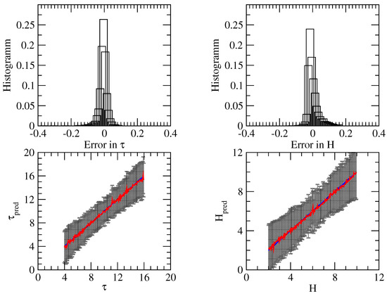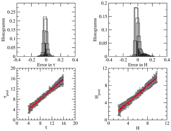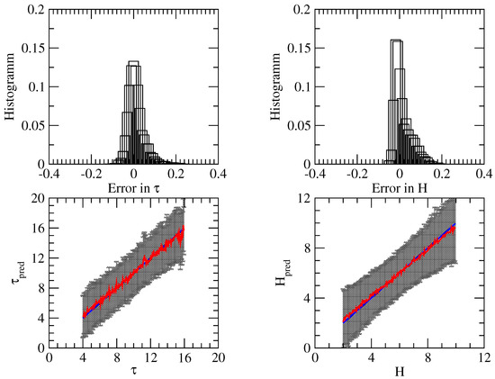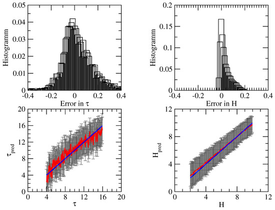 In this section, we design several neural networks for atmospheric remote sensing. To test the neural networks, we considered a specific problem, namely the retrieval of cloud optical thickness and cloud top height from radiances measured by the Earth Polychromatic Imaging Camera (EPIC) onboard the Deep Space Climate Observatory (DSCOVR). DSCOVR is placed in a Lissajous orbit about the Lagrange-1 point, and provides a unique angular perspective in an almost backward direction with scattering angles between and . The EPIC instrument has 10 spectral channels ranging from the UV to the near-IR, which include four channels around the oxygen A- and B-bands; two absorption channels are centered at 688 nm and 764 nm with bandwiths of 0.8 nm and 1.0 nm, respectively, while two continuum bands are centered at 680 nm and 780 nm with bandwiths of 2.0 nm. These four channels are used for inferring the cloud parameters. To generate the database, we use a radiative transfer model based on the discrete ordinate method with matrix exponential [40,41] that uses several acceleration techniques, as for example, the telescoping technique, the method of false discrete ordinate [42], the correlated k-distribution method [43], and the principal component analysis [44,45,46]. The atmospheric parameters to be retrieved are the cloud optical thickness and the cloud top height H, while the forward model parameters are the solar and viewing zenith angles and the surface albedo. Specifically, we consider the fact that the cloud optical thickness varies in the range , the cloud top height in the range km, the solar and viewing zenith angles in the range , and the surface albedo in the range (only snow/ice free scenes are considered). The simulations are performed for a water-cloud model with a Gamma size distribution with parameters m and . The droplet size ranges between 0.02 and 50.0 m, the cloud geometrical thickness is 1 km and the relative azimuth angle between the solar and viewing directions is . The absorption cross-sections are computed using LBL calculations [47] with optimized rational approximations for the Voigt line profile [48]. The wavenumber grid point spacing is chosen as a fraction (e.g., ) of the minimum half-width of the Voigt lines taken from HITRAN database [49]. The Rayleigh cross-section and depolarization ratios are computed as in [50], while the pressure and temperature profiles correspond to the US standard model atmosphere [51]. The radiances are solar-flux normalized and are computed by means of the delta-M approximation in conjunction with the TMS correction. We generate 20,000 samples by employing the smart sampling technique [52]. Among this data set, 18,000 samples were used for training and the other 2000 for prediction. The noisy spectra are generated by using the measurement noise , where for the jth channel, we use with being the average of the simulated radiance over the N samples.