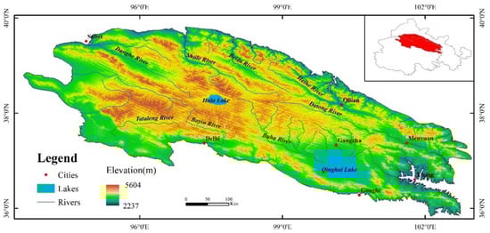 The Qilian Mountains (35°48′–40°05′N, 93°18′–103°54′E) are located in northwestern China, to the northeast of the Qinghai-Tibetan Plateau (QTP), in Gansu and Qinghai Provinces (Figure 1). The total area is 1.84 × 105 km2, with an elevation of 1623–5766 m [30]. The QLM is an important ecological security barrier in western China. Many inland rivers that originate from the QLM are important freshwater sources for the Hexi Corridor, maintaining the freshwater balance and oasis stability in the area. The QLM are composed of a number of NW-trending high mountains and valleys. The overall terrain characteristic is that the west is higher than the east, with high altitudes and complex and special geomorphological features. The QLM have a typical continental plateau climate, which is dry and cold, and it gradually becomes colder and drier from east to west. The annual average temperature is low, about 0.6 °C; and the ranges of annual and daily temperature are relatively large. The annual precipitation is about 400–700 mm, and it decreases from east to west and increases with elevation. The region has a high solar radiation intensity, with most areas receiving more than 2800 h of sunshine. The land cover types in the QLM are diverse, mainly including croplands, forests, grasslands, shrublands, wetlands, water bodies, construction lands, and bare lands, among which the grasslands and meadows account for a large percentage of the total area. The main crops are wheat, oilseed rape, highland barley, oats, maize, broad beans, and potatoes.