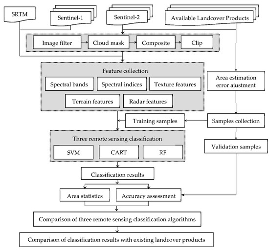 Although there are a variety of widely used land cover products, such as those mentioned above, due to the differences in the data sources, classification schemes, and classification methods of the different data products, their adaptability and accuracy in some specific areas tend to be uncertain. Therefore, it is vital to produce more precise and accurate land cover products for a certain area. For example, Zhang et al. used the Sentinel-2 time series based on the tile model and the RF algorithm based on the GEE platform to automatically generate a high-resolution land cover map of Madagascar, with a high overall accuracy (OA) of 89.2% [22]. Zeng et al. used Landsat 8 image data and the RF algorithm based on the GEE platform to analyze watershed land cover mapping in Nzhele and Levhuvu, with an OA of 76.43% [23]. Midekisa et al. used the Landsat 7 ETM+ surface reflectance data in 2000 and 2015 and the RF algorithm based on the GEE platform to automatically generate the 30 m resolution cover map of the African continent and analyzed its change characteristics [24]. Based on Landsat 8 images, RF algorithm, and GEE platform, Tassi et al. produced the land cover map of Maiella National Park in Italy [25]. Despite all this research, the available studies still lack a comparison of the classification performances and effects of the different classifiers in the same research area.