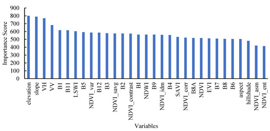 Using the “explain” function provided by the GEE cloud platform, the importance of each of the feature variables of the random forest (RF) classifier when participating in the classification was determined. The contribution of the variables to the classification results was greater if they had a higher importance score [55]. Figure 4 shows the importance score distribution of the 31 input feature variables involved in the classification. As can be seen from the figure, terrain features and radar features had higher importance scores, while the lower importance scores were for spectral bands, spectral indices, and texture features. Specifically, among the terrain features, the importance of the elevation feature was the highest (801.24), followed by slope feature (789.51), and the importance of the aspect and hill shade were relatively low. Radar features including VV and VH had high importance scores, with average values of 769.23 and 681.5, respectively. Spectral bands B1, B11, B5, B12, B3, and B2 of the Sentinel-2 images had generally higher importance scores during the classification, and their average values were all >560. Among the six spectral indices, the LSWI had the highest importance scores, with an average value of 603.5, which indicated that they were very important for water recognition. The importance scores of the texture features were generally low, among which the NDVI_idm, NDVI_corr, NDVI_asm, and the NDVI_ent were the lowest, with their values all <560.