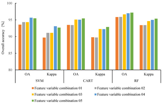 The influences of the different feature variable combinations on the overall accuracy (OA) of the classification results. Feature variable combination 01: spectral bands; feature variable combination 02: spectral bands + spectral indices; feature variable combination 03: spectral bands + spectral indices + terrain features; feature variable combination 04: spectral bands + spectral indices + terrain features + radar features); feature variable combination 05: spectral bands + spectral indices + terrain features + radar features + texture features.