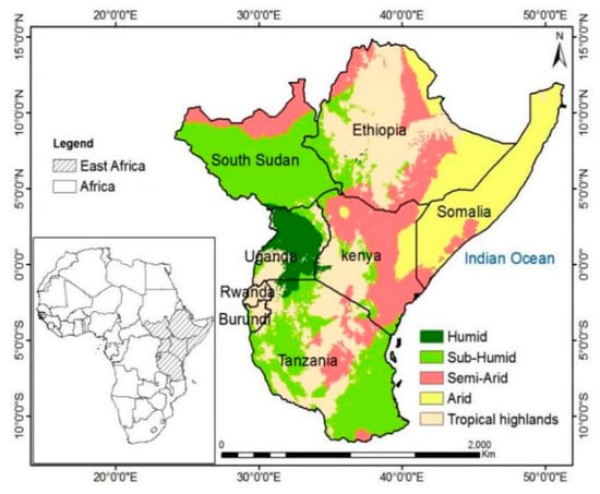 Droughts are considered a serious natural hazard, especially in semi-arid regions where devastating and catastrophic damages are recorded [1,2,3,4,5,6,7,8,9,10,11,12,13,14,15], and have been mainly categorized (on the basis of duration, impact and recovery rate) into meteorological (defined by a lack of precipitation over a certain period of time for a certain region), agricultural (defined by a period of declining soil moisture and reduced crop yields) and hydrological (defined by a reduced surface and subsurface water availability for a given water resource), and socio-economic drought, expressed to mean “a failure of water resource management to meet the supply and demand of water, taken as an economic good” [16,17,18,19]. The socio-economic definition of drought is a perspective that has not been applied to many studies/analyses of drought found in the literature as it is possibly seen as an outcome/impact of drought rather than a category of drought. Global estimates on the impacts of drought indicate that a total of 642 drought events were recorded globally between 1900 and 2013 resulting in the death of about 12 million people, directly affecting a population of over 2 billion, with estimated economic damage of about USD 135 billion [20,21]. Love [22], Masih et al. [21], Funk et al. [23,24,25], and Yang [26] confirm that the East African region ranks among the most vulnerable and drought-prone regions of the world with a high potential for increased risk of agricultural droughts, and a recent event recorded in 2016/2017. Hence, while the frequency and severity of drought within the region has increased in the last couple of decades, the situation is forecast to increase over the coming decades [27,28,29]. Therefore, it is considered necessary to continue investigations into better methods of understanding drought occurrence within the East Africa region as a critical step towards building resilience and adaptability among the population of the region, and indeed other semi-arid regions in other parts of Africa [30,31,32].