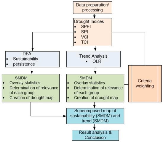 Four (4) drought indices were used in this work. The performance of each index during drought conditions over the whole study area was assessed and the four drought indices were used in this report to combine and produce a spatial drought risk map through a spatial multi-criterion decision making process. The indices include: standardized precipitation index (SPI), standardize precipitation evapotranspiration index (SPEI), temperature condition index (TCI), and vegetation condition index (VCI). SPI is ranked as the most importance drought parameter over the region according to [50]. The spatial maps of trend (slope) and persistence (DFA) from the drought indices were also computed. The criteria weighting technique according to Saaty’s [51] was done based on the statistical performance evaluation methods before the application of SMDM. SMDM was applied to merge the four drought indices into a single drought risk map for easy analysis and interpretation. Finally, a superimposed sustainability map of persistence (SMDM) and slope (SMDM) was obtained to capture drought changes at larger and shorter time scales. The flowchart of the work is show in Figure 2.