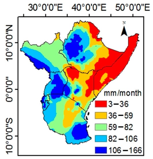 Overall, the northeastern region received a lesser amount of precipitation in the study. The amount of precipitation decreases as the distance from the lower longitudes decreases towards the Indian Ocean from longitude 14°E to 75°E (Figure 3). The region with the lowest precipitation on record is the northeast, around Somalia and parts of Ethiopia, while the highest precipitation occurs around Lake Victoria and the mountainous regions [44,67]. The hydrological climate comprises of two rainy seasons, one from March to May (MAM) and another from October to December (OND) [68]. According to Gebrechorkos et al. [8], regions located nearer to the equator are characterized by a long and short rainy season with higher amounts of precipitation during MAM and OND, while in JJAS precipitation is high around the Ethiopian highlands. Further, precipitation from January to February (JF) is low with high temperature values. The main reasons for high precipitation around the northwest and equatorial regions include local topographic factors, regional circulation, coastal influences, and remote forcing [44]. While some of the northeastern regions also experience precipitation, the magnitude and frequency are less than the areas around the equatorial and mountainous regions. The monthly evolution of precipitation makes this region more susceptible to drought. Therefore, the impacts of drought are more experienced in the northeastern parts compared to other regions.