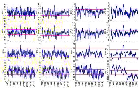 where is the temperature at any time period i. and are the long term maximum and minimum temperature records, respectively. We used TCI-1, TCI-3, TCI-6, and TCI-12 aggregated at 1, 3, 6, and 12 months, respectively. The ranges of values and their respective classes for the indices are shown in Table 2.
