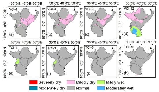 In Figure 5, the result shows mean spatial 1–12 month aggregated VCI and TCI grouped according to the ranges given in Table 2. The spatial representation of SPEI and SPI (though not displayed in Figure 5) indicated normal values for all the time scales. VCI-1 indicated mean drought conditions from severely dry to mildly wet while VCI-3, 6, and 12 indicated mean drought conditions from severely dry to moderately wet. In addition, TCI-1, 3, and 12 indicated drought conditions from mildly dry to mildly wet while TCI-6 ranged from normal to mildly wet conditions. Arguably, normal drought conditions dominated the study area for all the time scales followed by mildly dry. Other drought conditions, such as severely dry, moderately dry, and moderately wet conditions, were found in small percentages. Mildly dry conditions were located in parts of Ethiopia, Kenya, South Sudan, and a few scattered pixels in Uganda and Tanzania while for VCI-12, mildly dry pixels were distributed in South Sudan, northern Ethiopia, northern Kenya, and some few pixels scattered in Uganda. The rest of the pixels showed normal drought conditions.