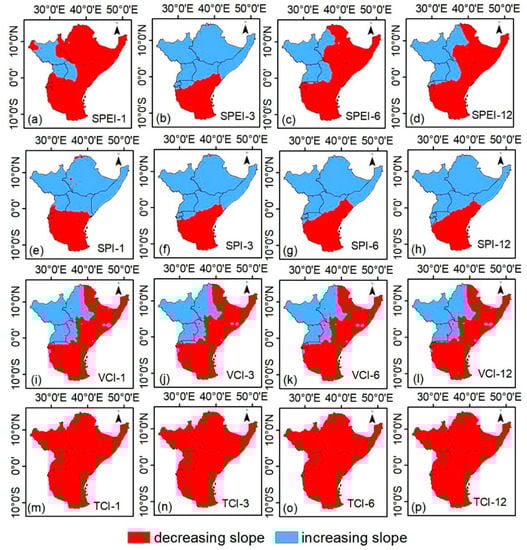 Spatial regression slope analysis for (a–d) SPEI, (e–h) SPI, (i–l) VCI, and (m–p) TCI from 1982 to 2015.