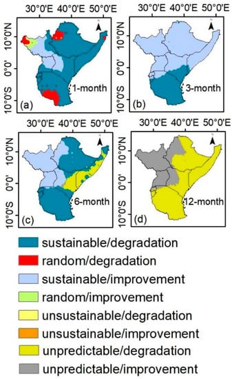 Figure 9 shows the superimposed map of slope (OLR) and Hurst exponent (DFA) at different time scales to reveal the final drought risk map which is an approach for mapping drought sustainability. For example, at a 1-month time scale OLR-1 and DFA-1 were superimposed to produce the final drought risk map. The results indicate that drought conditions may eventually persist, reverse, or vary drastically depending on the driving forces. At the 1-month time scale, about 73.0, 8.8, 15.7, 2.5, 0.1, and 0.0% pixels showed sustainability/degradation, random/degradation, sustainability/improvement, random/improvement, unsustainability/degradation, and unsustainability/improvement, respectively as shown in Figure 9a. Regions with severe drought but considerable improvement are located around parts of Ethiopia, Somalia, eastern Kenya, southern Uganda, Rwanda, Burundi, and some parts of Tanzania while regions with random drought distribution and considerable degradation at the 1-month time scale include eastern Ethiopia, eastern South Sudan, and southern Tanzania. At the 3-month time scale (Figure 9b), about 72.6 (27.4) % pixels showed sustainability/improvement (sustainability/degradation). Areas with sustainable/improvement are distributed in Ethiopia, Somalia, South Sudan, Uganda, Rwanda, parts of Tanzania, Burundi and Kenya while regions with sustainable and degraded portions are located in southern Burundi and Tanzania. In addition, at a 6-month time scale, about 54.2, 32.8, 12.6, and 0.4% of pixels showed sustainability/degradation, sustainable/improvement, unpredictable/degradation, and unpredictable/improvement, respectively (Figure 9c). Regions with sustainable and improved pixels are located in Northwest Ethiopia, South Sudan, Uganda, and Western Kenya while pixels with sustainable and degradation are majorly distributed in Northeast Ethiopia, parts of Kenya, Rwanda, and the entire landmass of Tanzania. Meanwhile, regions that were unpredictable but showed considerable degradation were scattered over Somalia and Eastern Kenya. More so, at the 12-month timescale (Figure 9d), about 36.70 (63.30) % of pixels were unpredictable/improved (unpredictable/degraded) over the study area.