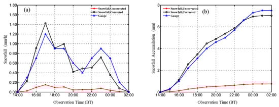Comparison between estimated snowfall (red line: original , black line: corrected ) and observed snowfall by weighing gauges (blue line) for (a) hourly and (b) accumulation, respectively, on 29 November 2019 from 14:00 to 02:00 the next day.