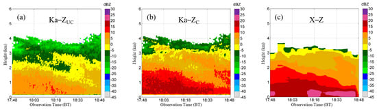 The XPOL and MMCR reflectivity within 17:48–18:48 on 29 November 2019 (a) before the MMCR reflectivity correction and (b) after the MMCR reflectivity correction, (c) XPOL reflectivity.