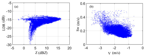 Scatter diagram of the relationships among the MMCR parameters in surface graupel processes: (a) Z-LDR and (b) V-Sw.