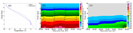 Four polarization parameters (i.e., , , and ) were used to classify the hydrometeor phases. In addition, temperature was considered as a key parameter in phase classification. The temperature profiles from microwave radiometer are consistent with those from the L-band digital radiosonde during the 30 snowfall cases (Figure 8). The average deviation is 3.2 °C and is 0.98, which are consistent with the result of [36].