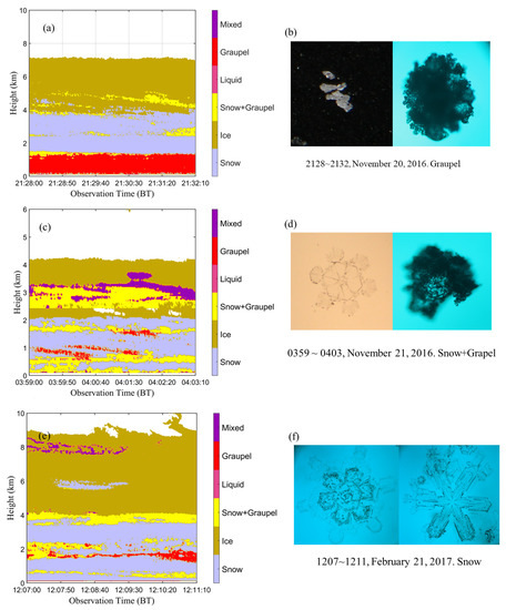 Due to the scarcity of aircraft data, only the hydrometeor classification results near the surface have been validated, and the identification results of upper-air particles are discussed. A multi-phase transformation precipitation process occurred from 20 to 21 November 2016. As shown in Figure 9a,c,e, there were around three layers in the vertical direction, including the ice crystal layer, mixed snow-graupel layer and snowflake layer (or graupel particle layer) from top to bottom. At 21:30 on 20 November 2016, the size of graupel particles at the surface was between 1 and 3 mm. At 04:00 on 21 November 2016, a mixed snow-graupel was observed, with the snowflake size of 2–4 mm. It was also consistent with the MMCR phase-identification results at the same period (Figure 9a–d). For another snowfall case on 21 February 2017, hexagonal platelets and six-branched snowflakes were mainly observed, with the snowflake size at 4–6 mm. It also compared well with the MMCR phase identification result (Figure 9e,f).