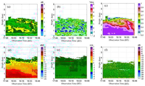 XPOL and MMCR parameters of the snowfall cloud system from 17:48 to 18:48 on 29 November 2019. (a–c): XPOL (, and ), respectively, and (d–f): MMCR (, and ), respectively.