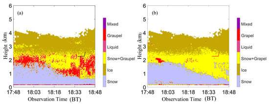 Phase classifications for hydrometeor particles from 17:48 to 18:48 on 29 November 2019 based on (a) MMCR (18:37–18:42, the black line at the height of 2.2–2.5 km is the aircraft detection area) and (b) combination of XPOL and MMCR (the red line: same as the black line in (a)).