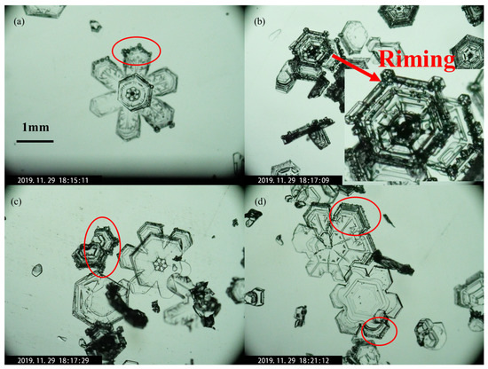 (a–d) Images of surface hydrometeor particles from 18:15 to 18:21 on 29 November 2019.