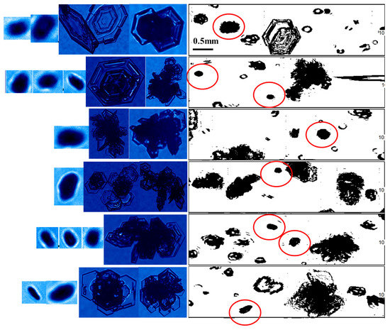 From 18:18 to 19:30 on 29 November 2019, the King Air aircraft carried out joint detection with a radar in a spiral ascent for vertical detection over the cloud radar from 18:37 to 18:43. Due to air-traffic limitations, the effective detection range was 2263 m to 2563 m in the vertical direction. Figure 13 shows the flight path and vertical detection over the MMCR. Figure 14 shows the particle images observed by the aircraft from 18:37:50 to 18:42:06. The results show that the snow cloud system mainly consists of graupel particles (in the red circle), hexagonal platelets and six-branched snowflakes, with graupel particles of 0.2–0.5 mm. There was an aggregation among the hexagonal platelets and six-branched snowflakes in the upper air. Most of the snowflakes are larger than 1 mm. These results are consistent with the category of snow-graupel in Figure 11b, although inconsistent with the large range of graupel particles in Figure 11a. This indicates that the merged XPOL and MMCR results in higher accuracy than MMCR alone in identifying the phases of hydrometeor particles in the upper-air layer.