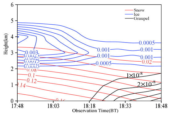 The configuration and time-height evolution for the specific mass of snow, ice crystal and graupel simulated at the YJP station are demonstrated in Figure 16. The snowfall appears to have been below 3.5 km, and the maximum specific mass of snow was greater than 0.16 g/kg. In addition, ice crystal particles occurred at the height of 2–5 km in the middle and upper levels, with the maximum specific mass greater than 0.003 g/kg. A seeder-feeder effect was found in the precipitation cloud system since fine configuration was found between the large-value areas of ice crystal and snow in terms of time and height at upper and lower levels. Moreover, the graupel content was found to be small, due to limited supercooled cloud water. Overall, the locations of the simulated snowflakes, ice crystals and graupel are consistent with the phases of hydrometeor particles between XPOL and MMCR.