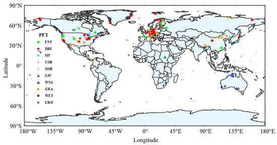 In this study, we used the FLUXNET2015 dataset and selected the site-year of daily GPP data with over 80% of the quality flag > 0.8. The quality flag indicates the percentage of measured and good-quality gap-filled data [25]. The FLUXNET2015 dataset has been quality-controlled and gap-filled according to strict quality standards [25,26,27]. The vegetation type of the site was classified into sixteen PFTs based on the International Geosphere–Biosphere Program (IGBP) land cover classification scheme [28]. In total, 145 flux sites covering 785 site-years of daily GPP data (GPP_DT_VUT_REF) from 2000 to 2014 were downloaded from the FLUXNET2015 dataset (https://fluxnet.fluxdata.org/) (15 May 2021), including 32 ENF (N = 215), 20 deciduous broadleaf forests (DBF, N = 132), 8 mixed forests (MF, N = 62), 2 closed shrublands (CSH, N = 10), 8 open shrublands (OSH, N = 29), 6 savannas (SAV, N = 15), 6 woody savannas (WSA, N = 34), 26 grasslands (GRA, N = 106), 20 wetlands (WET, N = 80), and 17 croplands (CRO, N = 102). These sites are shown in Figure 1, and their characteristics are listed in Table S1.