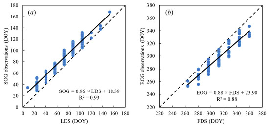 Relationships between (a) the last (snowmelt) dates of lingering snowpack (LDS) and the starting day of GPP (SOG), and (b) the first (snowfall) dates of lingering snowpack (FDS) and the ending day of GPP (EOG). Data with LDS-SOG and FDS-EOG of less than a month were selected.