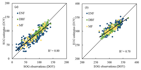 Scatter plots between (a) starting day of GPP (SOG) observations and SOG estimates, and (b) ending day of GPP (EOG) observations and EOG estimates for forest types: evergreen needle-leaf forest (ENF), deciduous broadleaf forest (DBF), and mixed forest (MF). Each point represents one FLUXNET site and one year.
