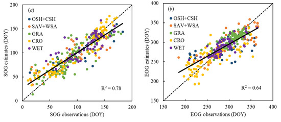 Scatter plots between (a) starting day of GPP (SOG) observations and SOG estimates, and (b) ending day of GPP (EOG) observations and EOG estimates for non-forest types: open shrublands (OSH), closed shrublands (CSH), savannas (SAV), woody savannas (WSA), grasslands (GRA), croplands (CRO), and wetlands (WET). Each point represents one FLUXNET site and one year.