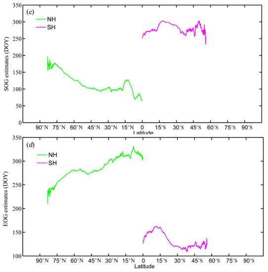 We investigated the spatial distribution of the global averaged SOG and EOG estimates for the period 2001–2017 (Figure 5a,b, respectively) as well as changes in SOG and EOG along with latitude (Figure 5c,d, respectively). Generally, the SOG decreases with a decrease in latitude, ranging from DOY 165 to DOY 80 between 85°N and 17°N, while it increases from DOY 80 to DOY 120 between 17°N and 13°N due to the arid climate of North Africa. Thereafter, it sharply decreases again from DOY 120 to DOY 65 between 13°N and the equator. In the Southern hemisphere, the SOG increases from DOY 250 at the equator to DOY 300 at 18°S, decreases from DOY 300 at 18°S to DOY 250 at 38°S, and then fluctuates between DOY 250 and DOY 300. The EOG increases with a decrease in latitude, ranging from DOY 235 at 85°N to DOY 305 at the equator. The EOG increases from DOY 130 at the equator to DOY 160 at 15°S, decreases to DOY 120 at 30°S, and then remains relatively stable from 30°S to 55°S in the Southern hemisphere.