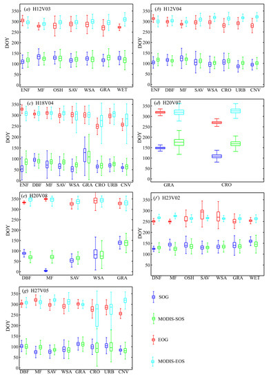 Box plots showing the averaged VPP estimates and MODIS-LSP for main plant functional types in each of the seven selected tiles in 2001–2017, (a) H12V03, (b) H12V04, (c) H18V04, (d) H20V07, (e) H20V08, (f) H23V02, and (g) H27V05. Evergreen needle-leaf forest (ENF), deciduous needleleaf forest (DNF), deciduous broadleaf forest (DBF), mixed forest (MF), open shrublands (OSH), savannas (SAV), woody savannas (WSA), grasslands (GRA), wetlands (WET), croplands (CRO), urban and built-up regions (URB), and cropland/natural vegetation (CNV).
