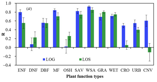 Relationships of length of photosynthesis phenology season (LOG) and length of growing season (LOS) estimates to two individual global GPP products, (a) GPPVPM from the VPM model and (b) GLASS-GPP from the EC-LUE model, across all plant functional types within the seven selected tiles. Correlation coefficients are averaged in 2001–2016. The black vertical lines are ±1 standard deviation. Evergreen needle-leaf forest (ENF), deciduous needleleaf forest (DNF), deciduous broadleaf forest (DBF), mixed forest (MF), open shrublands (OSH), savannas (SAV), woody savannas (WSA), grasslands (GRA), wetlands (WET), croplands (CRO), urban and built-up regions (URB), and cropland/natural vegetation (CNV).