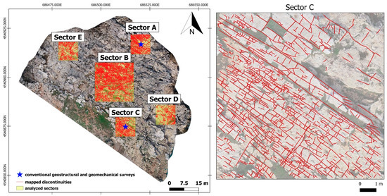 Sectors investigated by means of conventional geo-structural and geomechanical surveys and traces digitized in the orthophoto.