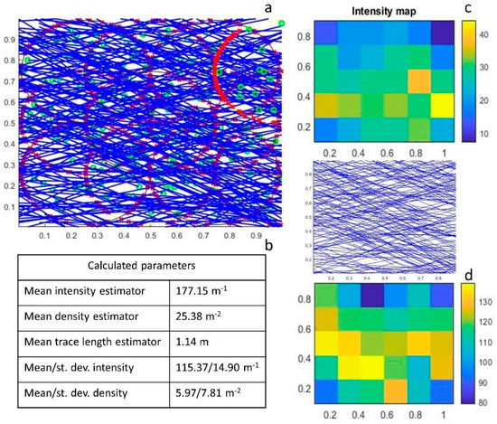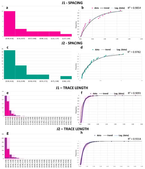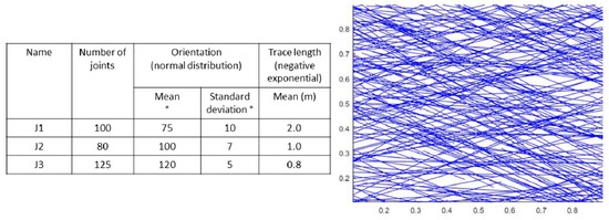 A synthetic dataset was created to gradually build the code. Three discontinuity sets (consisting of about 300 traces, in order to achieve statistical stability) were generated with strike and length following a normal distribution and a negative exponential law, respectively. The details of the synthetic dataset are illustrated in Figure 3. Successively, the 2D quantitative analysis was performed on the trace map (more than 1000 traces in sector C) of the case study and validated by comparing the results of the conventional geostructural and geomechanical surveys. To this aim, 50 discontinuities measured in the field in the same area were reported in Dips software [66] and classified into two main joint sets by means of stereographic projections (lower hemisphere). For each discontinuity set, the measurements of the spacings and trace lengths were elaborated in a spreadsheet to derive their mean values.