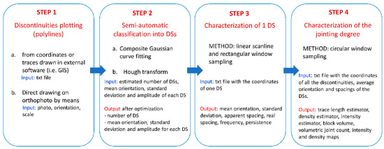 To this aim, we developed a user-friendly, adjustable, and repeatable MATLAB routine to characterize the discontinuity sets and the fracture network of low-relief areas on DOMs by introducing the well-known formulas of the literature in a digital environment. Starting from an orthophoto, or a file with digitized traces, the routine calculates the trace orientations (strikes), lengths, spacing, and persistence; defines the fracture intensity and density; and estimates the block volume and shape, allowing us to characterize the investigated area in a few minutes. An innovative feature of the MATLAB routine consists of the semi-automatic identification of the discontinuity sets by means of two methods and the consequent classification of the traces, which can be chosen and validated by the user.