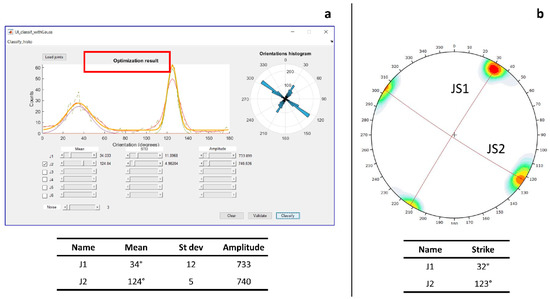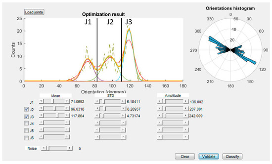 The orientations of the polylines are calculated from the strike of their segments and weighted according to their lengths by means of a square/rectangular window applied on the selected dataset. The number of discontinuity sets is identified by means of an innovative method, which semi-automatically plots the strike distribution of the traces on an appositely developed Graphic User Interface (GUI) (Figure 5). The MATLAB routine automatically extracts the distribution of each discontinuity set, with peaks corresponding to their mean strike. Three sliders allow adapting the strike distributions of each discontinuity set by interactively changing their mean, standard deviation, and amplitude. A line parallel to the x axis is used to filter out the “noise”, derived from random discontinuities, which might be present in traces from real rock masses. After the manual adjustment of the curves, an optimization algorithm is run so that the sum of the curves and noise fits the raw orientation histogram curve. In detail, the best solution to fit the synthetic curve on the original curve is obtained by minimizing the differences between the curve of the real data and the experimental composite curve by means of the fminunc (Find minimum of unconstrained multivariable) algorithm, which is based on the BFGS Quasi-Newton method [80,81,82,83]: