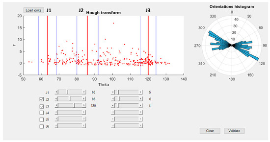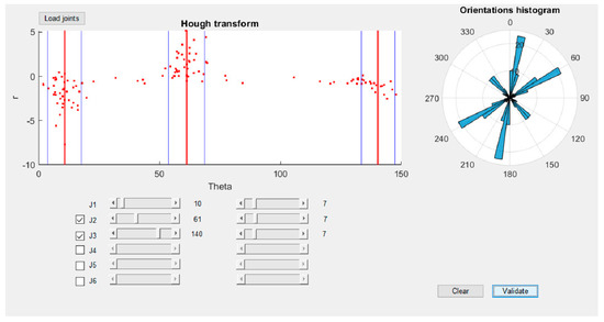 A second method to classify the discontinuity sets is based on the Hough transform, a technique introduced in [84] for machine analysis of bubble chamber photographs and later extended and adapted to image analysis and computer vision to detect shapes such as lines, circles, and ellipses in images [85,86,87,88]. Based on the Hough transform method, the MATLAB routine converts each joint in a new frame with the x and y axes corresponding to the orientation (θ) and distance from the origin (r) of each polyline, respectively (Figure 6). In this new frame, each joint is defined by a point, and joints with similar orientation are aligned on the vertical axis, allowing us to identify the main discontinuity sets (Figure 7).