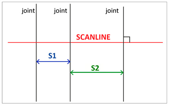 Normal set spacing calculated along a scanline (red) perpendicular to the mean direction of the joint set (black) (modified after [4]).