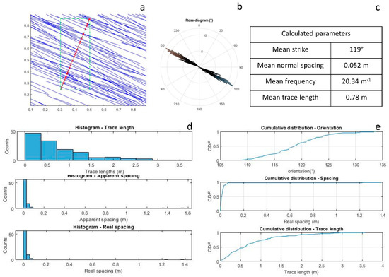 Step 3: linear scanline on JS3. (a) automatic generation of a linear scanline (black, dotted line) perpendicular to the mean strike of the discontinuity set; the discontinuities and their intersections with the scanline are, respectively, represented by the blue lines and the red crosses; (b) rose diagram of the JS; (c) table of the calculated parameters; (d) histograms of the calculated parameters; (e) cumulative distributions of the calculated parameters.