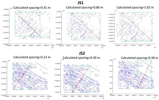 The Hough transform method is applied to calculate the spacing of persistent joints, assuming infinite lengths (Figure 6). For each two adjacent joints, the spacing is calculated as the mean difference along the r axis. In the Cartesian frame, the mean spacing is given by: