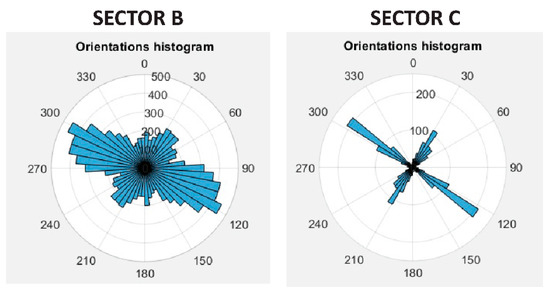 Geostructural and geomechanical surveys were performed at Pietra Piatta site on 4 November 2020 to carry out a quantitative analysis of the discontinuities in the Calcare di Bari Fm. We chose to adopt window sampling techniques rather than scanline methods to avoid orientation biases, since discontinuities subparallel to the scanline are difficult to detect [8,64]. A preliminary visual inspection in the field helped to estimate the main discontinuity sets. Successively, two 100-m2-wide squares were created on the rock mass with a tape, to collect information on the discontinuities intersecting or contained in the survey window, following [65]. These areas, corresponding to two of the five sectors later analyzed with the MATLAB routine (sectors A and C in Figure 2), were selected for the presence of easily recognizable planar surfaces. Moreover, for each joint belonging to the analyzed discontinuity set, the strike, spacing, persistence, opening, and filling were measured by means of a Wilkie-type compass and a measuring tape. Roughness and wall strength were estimated using, respectively, a profilometer (Barton Comb) and a sclerometer (L-type Schmidt hammer). The strike data of the detected discontinuities were processed using the Dips software [66] by means of equal-angle stereographic projections (lower hemisphere) to identify the main DSs and calculate their statistical parameters. Successively, the geometrical data (i.e., spacing and trace length) collected in the field were processed on spreadsheets.