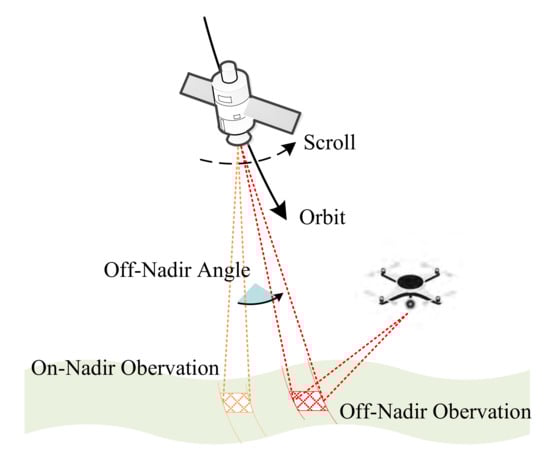In outline, as an optical satellite pursues its orbit, the onboard high-resolution cameras are able to scroll so that they can capture multiple images of the same object from different angles, rather than solely from overhead [25]. Unlike near-nadir satellite imagery, side-looking imagery can capture more relevant details of ground objects and yield more potentially useful information. Scroll imaging endows surveillance satellites with a better imaging range and a shorter revisit period than conventional mapping satellites [26]. For example, the GF-1 satellite has a revisit period of 41 days, together with 4 days for off-nadir angles; the GF-2 satellite has a revisit period of 69 days, together with 5 days for off-nadir angles.